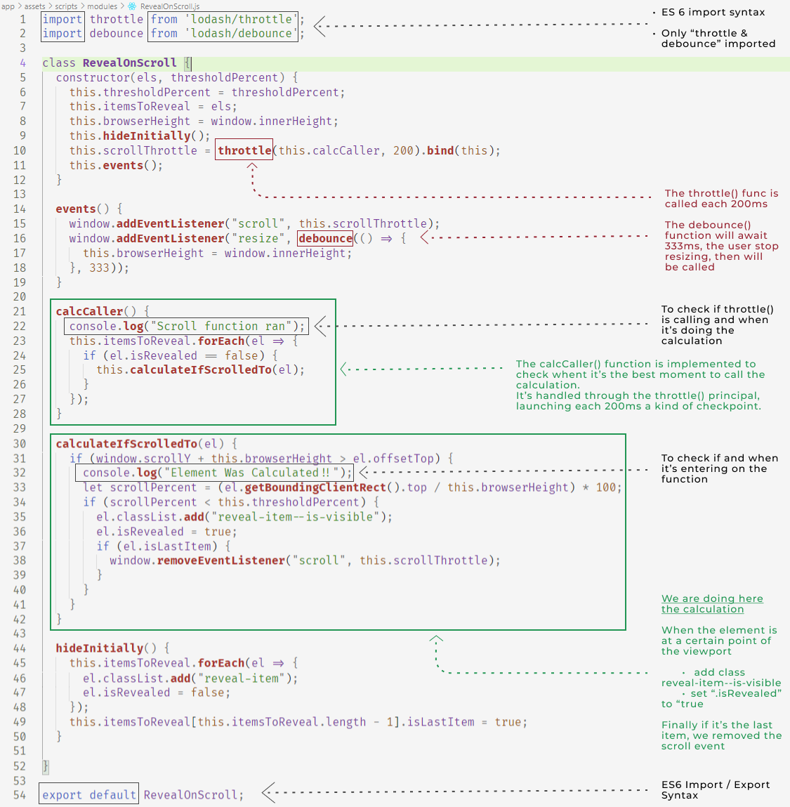 Pour des raisons d'optimisation, l'ajout de la librairie Lodash a été nécessaire pour pouvoir améliorer les performances javascript sur les "events" de "scrolling" et de "resizing". Seules les fonctions "Throttle & Debounce" ont été importées dans le projet, toujours pour des raisons de performances, limitant la taille de l'import au chargement. Pour implémenter ces "events", j'ai du établir une calculation sur le "Window Object" dès lors que l'utilisateur ira "scroller" ou redimensionner sa page web. Pour pouvoir limiter ces opérations, avoir plus de controle sur le code et optimiser celui-ci, l'utilisation de Lodash a été vraiment utile.